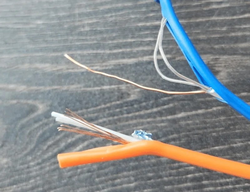 Проверка провода при сгибе: в синем используется однопроволочная жила, в оранжевом — многопроволочная